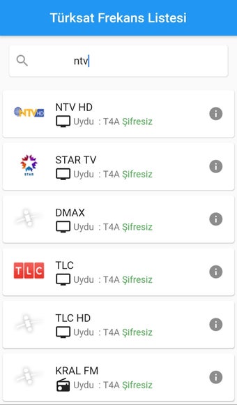 De 'Uydu Frekans Listesi - Türksat' is een gratis Android-app die gebruikers in staat stelt om televisie- en radiokanalen van de Türksat-satelliet eenvoudig te vinden. Deze applicatie biedt een actuele lijst van frequenties voor de Türksat T3A en T4A satellieten, waardoor het gemakkelijk is om zowel gecodeerde als ongecodeerde kanalen te ontdekken. Met een gebruiksvriendelijke interface kunnen gebruikers snel naar kanalen zoeken op basis van kanaal- of pakketnaam.